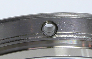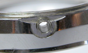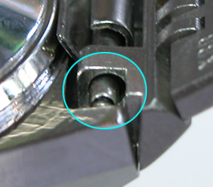 これが本来のバネ棒が通る穴とバネ棒の隙間。こちら交換側、バネ棒が細いので隙間が空いた為にベルトがしっかり付かない訳です。この太さのバネ棒が無かったので錆びたバネ棒を洗浄して戻しておきました。