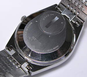 ベルトもオリジナル”スライドバンド”。ここまで綺麗とメンテナンスの意味があるのか?とさえ思えますがやってみましょう。これが裏蓋ですが本来は小さな電池蓋のみコインで開けて電池交換ですが大きな裏蓋を開けます。前回のGRAND TWIN QUARTZの様なことがあるかもしれないですからね。