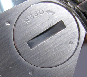 普通のバックルは○位置からドライバーを差し込みますが、このタイプは写真のドライバーの方からロックを外します。