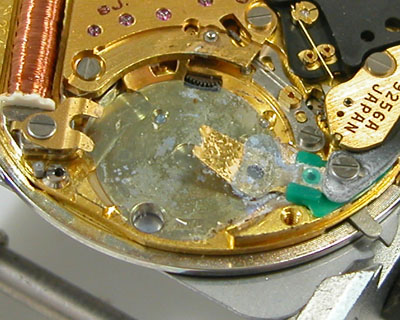 液漏れの跡。これでは何時止まるか分からない。それに回路の事を考えるとOHしても回路不良が怒ればお客様からみれば「直っていない」。となるとOHまでは出来ない=費用は頂けない=電池蓋パッキンは勿体ない。「電池交換のみでとりあえずは使えますよ」でお渡しするしか無いのです。