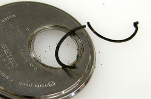 裏蓋の裏側もチェックして。電池蓋パッキンは硬化してパリパリ。