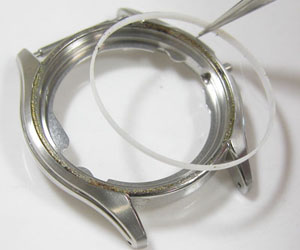 次ぎにベゼル&ガラスを外しますが開け口は12時位置。ベゼルの裏側のサビが気になります。