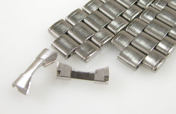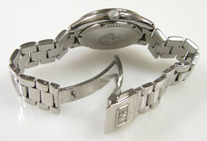 ステンレス無垢バンドに三つ折れプッシュバックル。