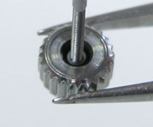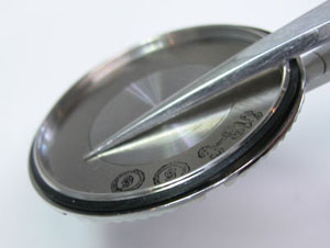 このスクリューバックが以外に堅くてG-SHOCKの200m並に大きなバイスにセットしてから渾身の力で開けました。これは堅く閉めたというよりもゴムパッキンが微妙に吸い付いてしまった感じですから同じ力を入れてもコツが必用です。興味本位で中を覗いてみようという発想で工具を使えばキズだらけのパターンですか。
