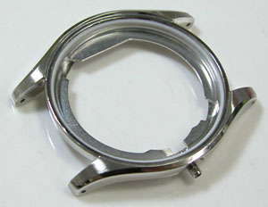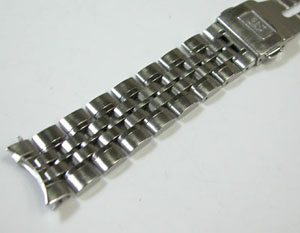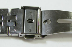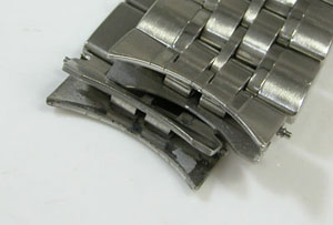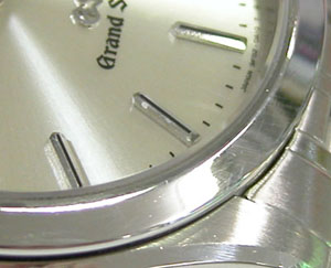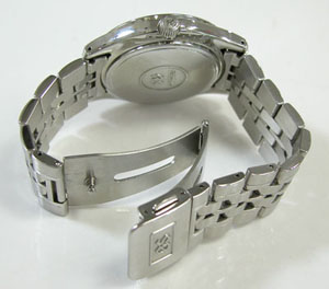 ステンレス無垢バンドに三つ折れプッシュバックル。7時のインデックスの付着物を除去のご依頼もですが7時だけでは他もありますね・・・付着物では無く湿気が入って水滴が乾いた跡ですからいたるところといった方が正確か?