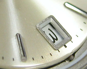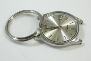 ベゼル&ガラスを外しますが軽い。何度も開け閉めすると締め付けが軽くなります。7時のインデックスのみならずカレンダー枠も水滴の跡が。