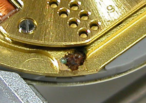 錆びた塊がカレンダー枠を通って文字盤に出たものが不着していた訳です。