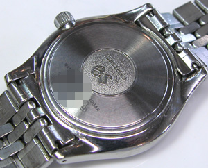 こちら裏蓋記載。裏蓋の裏側には金色の耐磁プレートが。