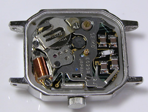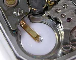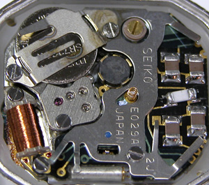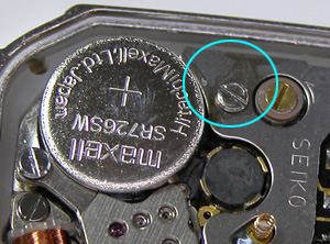 これがムーブメント。拡大、電池押さえのネジのあたりが変色していますが・・液漏れか?
