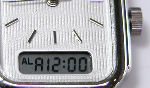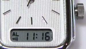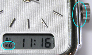さてアラームの時刻あわせは、この表示にしてから写真の様に竜頭を一段引いて早送りですが。では”アラームのON・OFF設定”は?