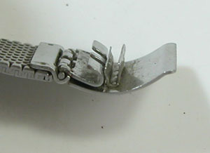 「バックルの動きが悪い」と言う、ことでテッキリ。スライド側と思ってチェックしても異常無し。ところが引っかけ側が掛からない。本来は右の写真の様に2枚、合わさった爪で食い付きます。これが左の様に1枚しか無いでは留まらない訳です。