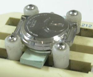 裏蓋を閉めましたが電池の蓋が外れないというか、回せない。指で時計を固定したくらではビクともしないのでバイスにセットして電池蓋を回します。