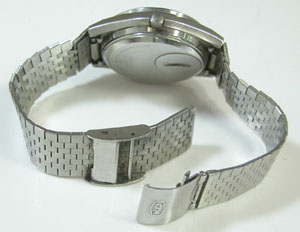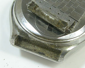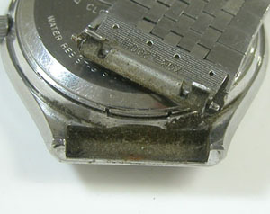 この当時のステンレス無垢バンドですが薄型とはゆえ密度が濃い。4・5回くらい洗浄し直しても黒い汁が出て来ます。かといって別料金と言う訳にもいかず、キリもないので適当におきます。よってワイシャツの袖が黒くなる可能性もありますから注意が必要です。兎に角は洗浄して綺麗になったところで。