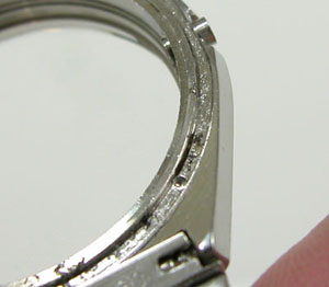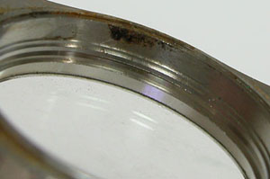 裏蓋の裏側もチェックします。サビがきておりますがパッキンが効いていた事がわかります。