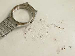 洗浄の前にケースのサビを削り落とします。内側にもサビが見られます。