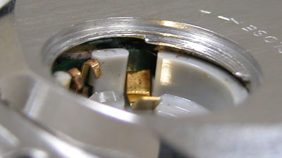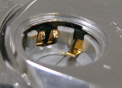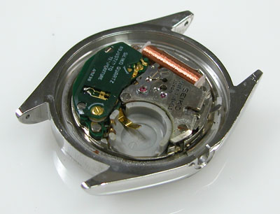 綺麗になったケースにムーブメントを戻して・・・ピンぼけましたが電池が湿気でかなり曇っております。それは当然で「電池蓋にパッキンが入っていない訳ですから」