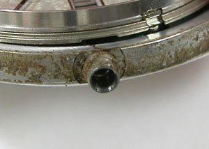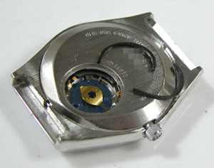 裏蓋は中央のバネで留まっておりますが錆びて不動。これを開けるには根気しかありません。無理に開けるとバネが壊れます。