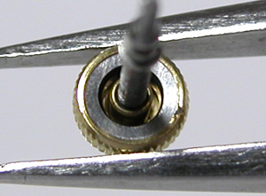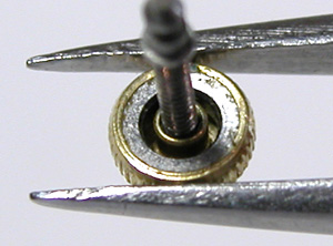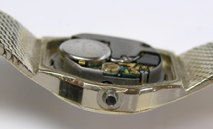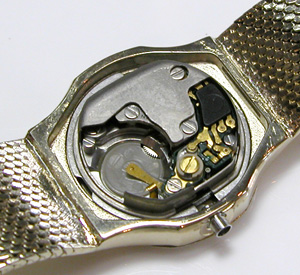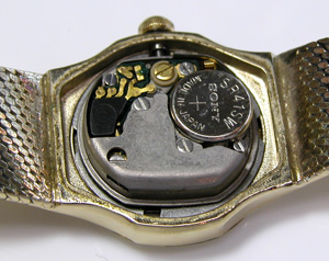 ムーブメントを戻して、電池格納部をチェックします。磨いた裏蓋を閉めて。