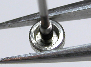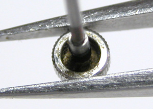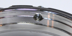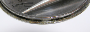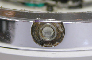 どこまでこのサビが落とせるか?竜頭の横には大きなメッキの剥がれがあります。