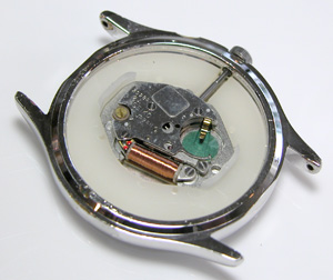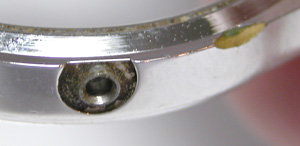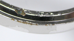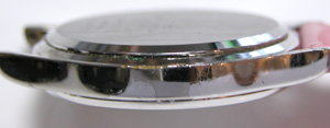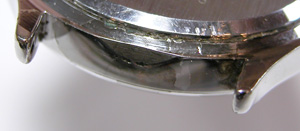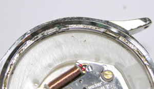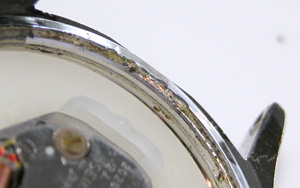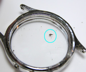 裏蓋を開けるとケースの腐食が見えます。この位置が特に、でも裏蓋がシッカリ食いついていますから問題はないでしょう。
