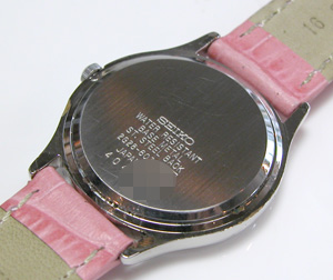 磨いた裏蓋を閉めて、バンドの取付。ハイ、電池交換メンテナンス完了です。この腕時計はメンズですし、お父さんが使っていたものという事ですから元は黒か茶のカーフベルトとが付いていたと思います。