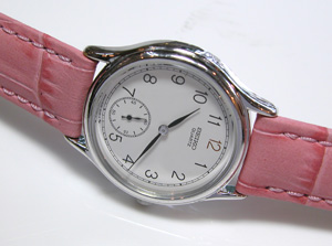 ラグ部幅が16mmですから細い目。スモセコ文字盤のデザインで”12のインデックス”のみが赤になっていますからベルトをピンクに交換するのみで、レディースウォッチにしか見えないです。ナイスなコーディネートですね。