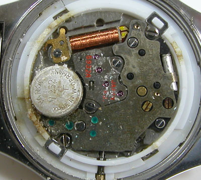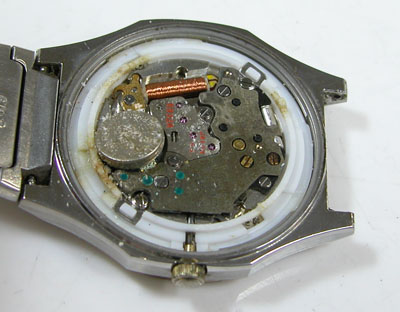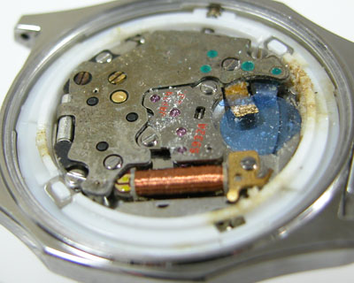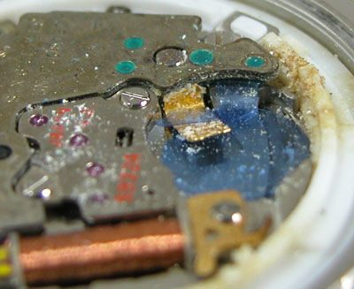 綺麗になったケースにムーブメントを戻して電池格納部をチェックしますが。