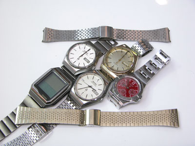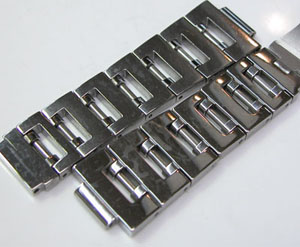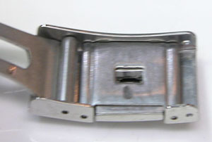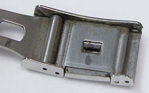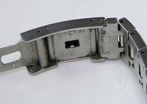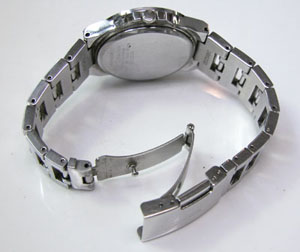 ステンレス無垢バンドに三つ折れプッシュバックル。微調整部分の位置をチェックしておきましょう。
