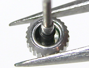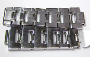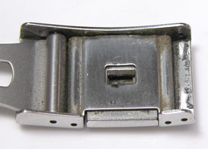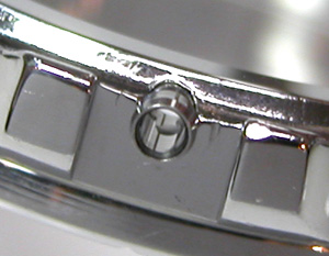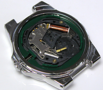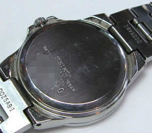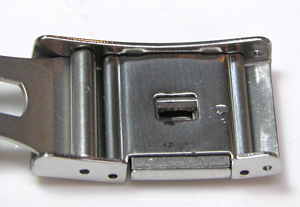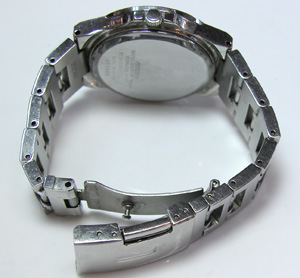 ステンレス無垢バンドに三つ折れプッシュバックル。裏蓋は”はめ込みタイプ”