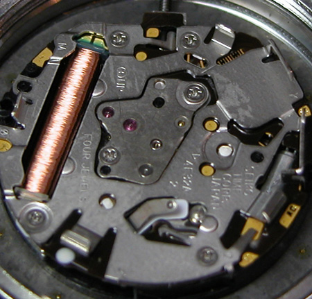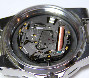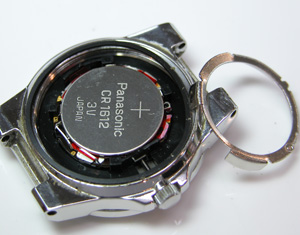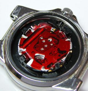 電池を取り出し。赤い絶縁フィルムが見えますから外します。これがムーブメント。