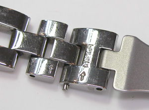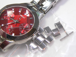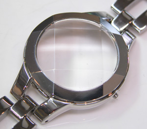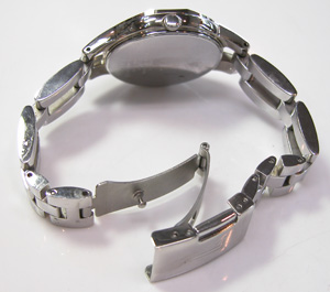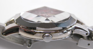 ステンレス無垢バンドに三つ折れプッシュバックル。そして強烈なカットガラスが印象的。