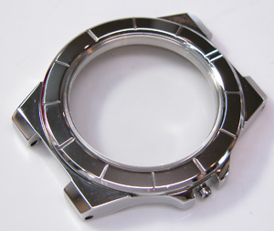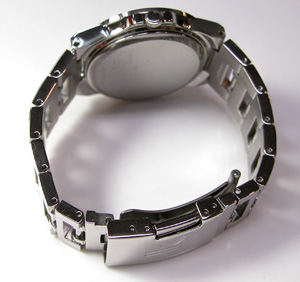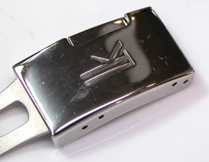 ステンレス無垢バンドに三つ折れプッシュバックル。
