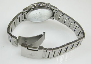 ステンレス無垢バンドに三つ折れプッシュバックル。