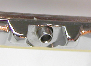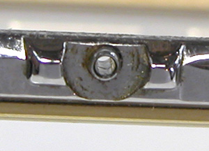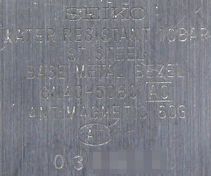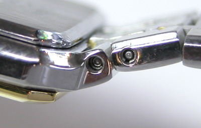 ステンレス無垢バンドに三つ折れプッシュバックル。裏蓋は”はめ込みタイプ”。