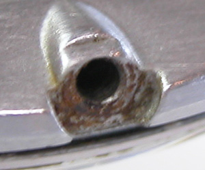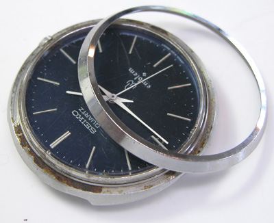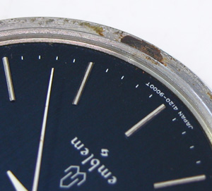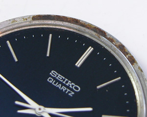 ベゼルとケースの隙間の錆が凄い。こういった所はこの時計の場合、電池交換のみでは気がつくことがありません。
