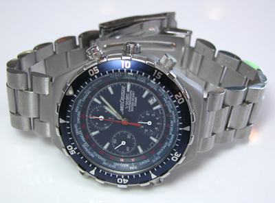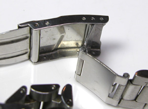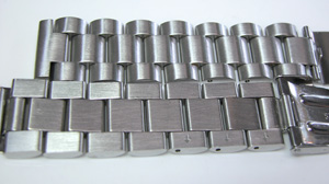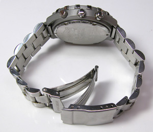 ステンレス無垢バンドに三つ折れダブルロック。エクテンションバックルはダイバー仕様。