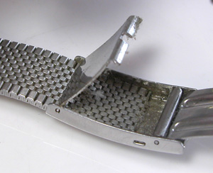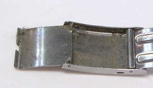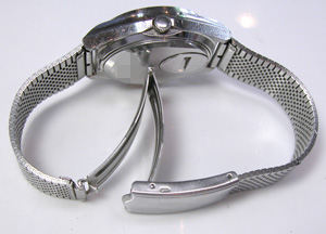 起こすとバンドを引き抜く事が出来ます。このベルト調整は引き抜いてカットする訳です。裏蓋は電池蓋があるタイプ。大きな裏蓋を開けます。