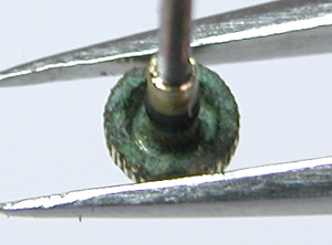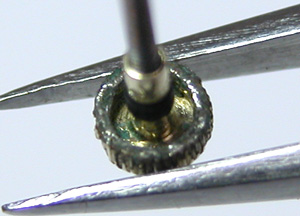 先ずは、竜頭を抜いて。この腐食はどうしようもありません。ここまで錆びています。これは交換した方が良いのですが規定の料金以内でという事ですからこのままです。これ交換のみで3500円くらいですか。ドルチェなどの黒いオニキスが付いた竜頭で5.000円くらいです。