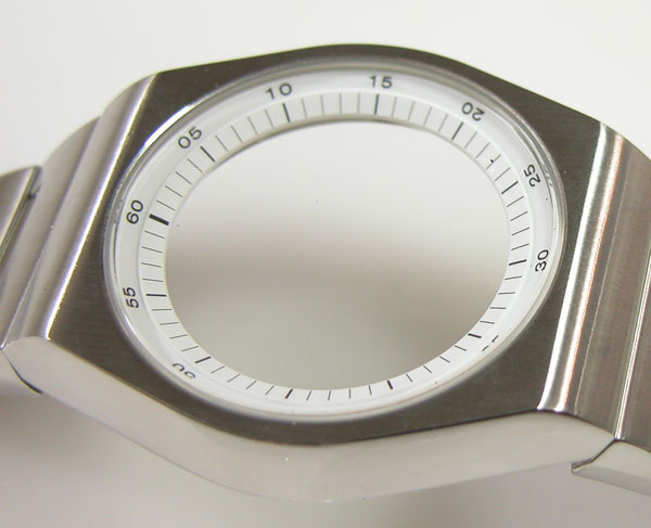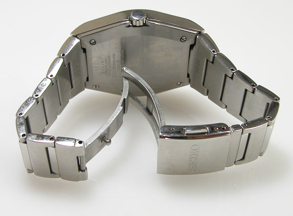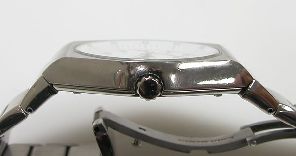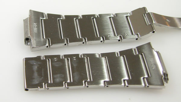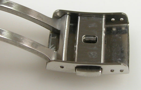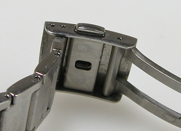 ステンレス無垢バンドに三つ折れプッシュバックル。