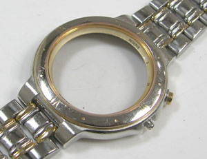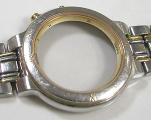 ガラスの内側に目盛のリングがありますが、おそらくクリーム色くらいの物だたと思いますが茶色く変色しております。これの修復もご依頼ですが、これは交換しか方法は無いです。拭くと悲惨な状態になります。ただ外すにはガラスも外す必用がありますがこのタイプはハズのは簡単では無い。