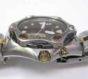 回転ベゼルに、ねじ込み竜頭はダイバー仕様。そしてステンレス無垢バンドに三つ折れダブルロック。
