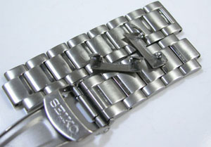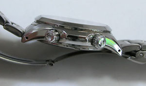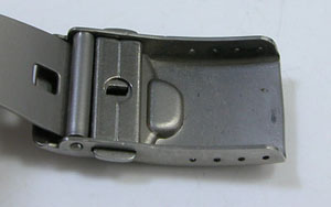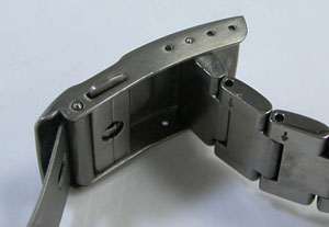 チタン無垢バンドに三つ折れプッシュバックルはダブルロック。