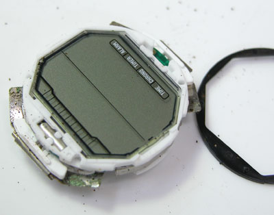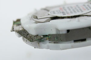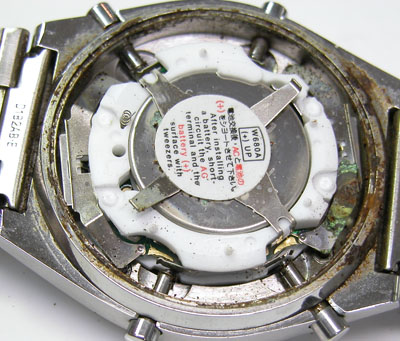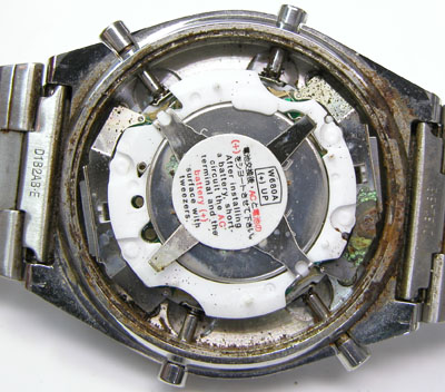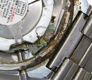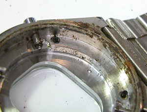 ムーブメントにも錆びた粉。ただ救いはアナログでは無いので歯車が無いので動作に影響は無い。洗浄して綺麗になったところで。