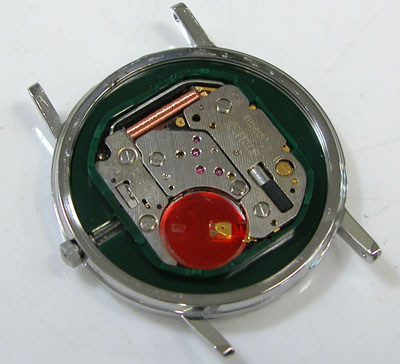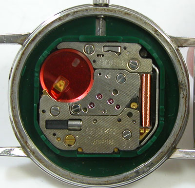 綺麗になったケースにムーブメントを戻して電池格納部をチェックします。電池交換で動きはしますがムーブメントのくすみが気になるのと12月ですから注油もしておきます。