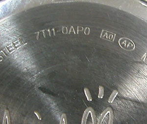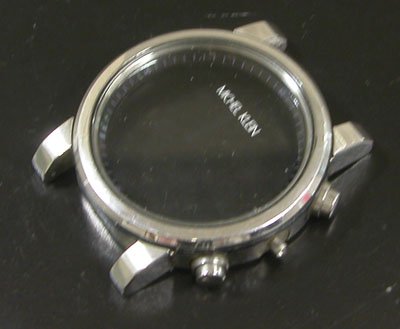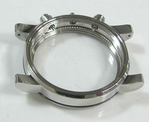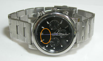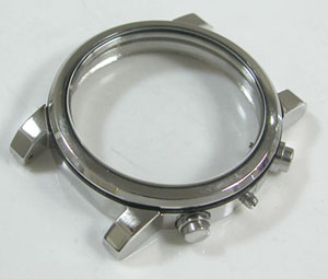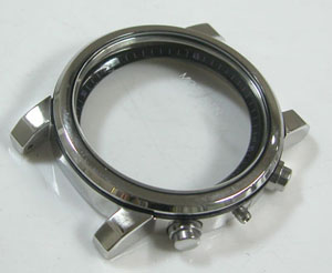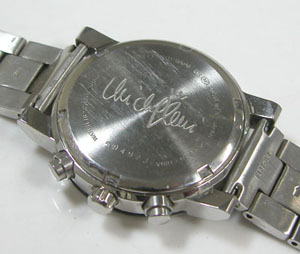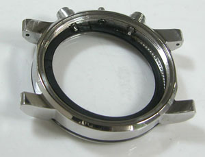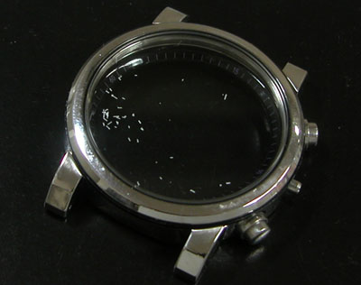ブランド・ロゴはガラスの内側にプリントですから洗浄が出来ません。そこで裏蓋を閉めて竜頭を付けて洗浄。外観は綺麗になりましたがやはり湿気が若干入ったので拭き取りですが。