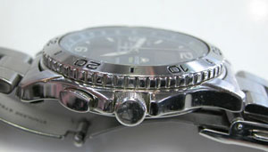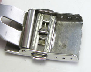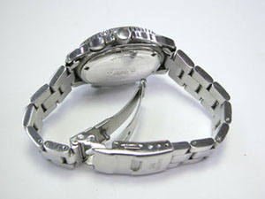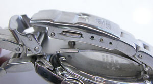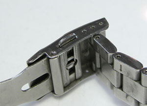 ステンレス無垢バンドに三つ折れプッシュバックル。