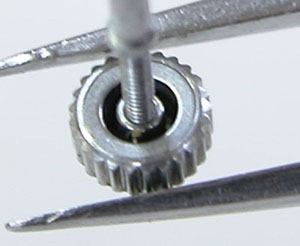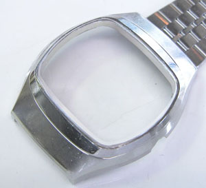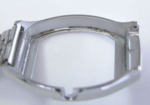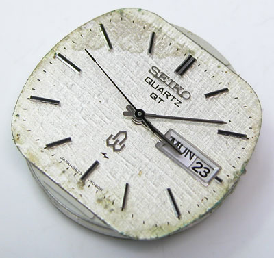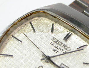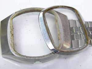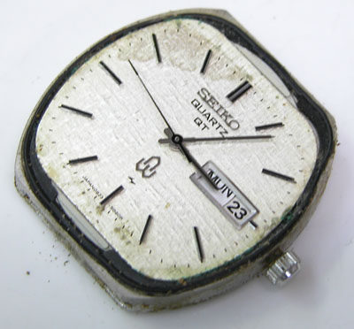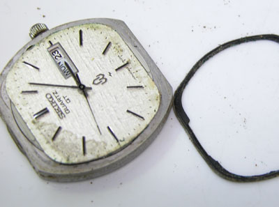 さすがに文字盤回りのこの変形パッキンは交換不可。古いクォーツは時代背景が高級品扱いでしたから、その腕時計の為にパッキンが製造され特殊な形状の物が多い。よって年数が経てば交換用のパーツに代用品がありません。