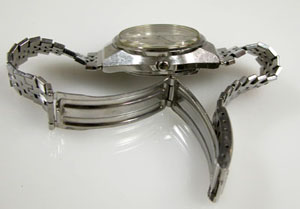 ステンレス無垢バンドに三つ折れバックル。かなり伸びておりますが、オークション調達なのかご依頼は「タバコ臭いので洗浄」というご依頼です。確かに強烈に臭います。
