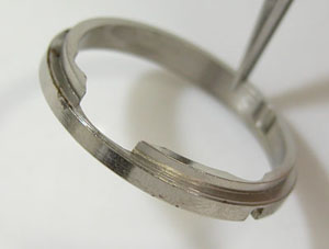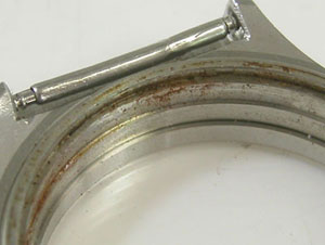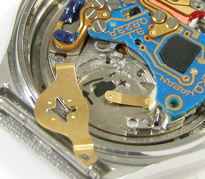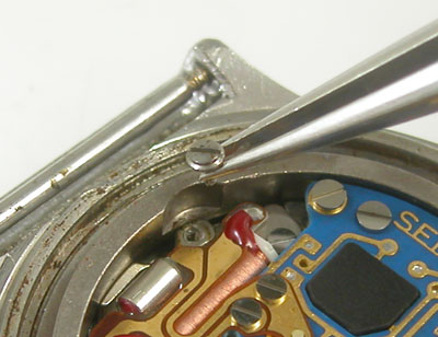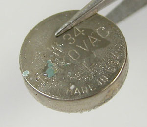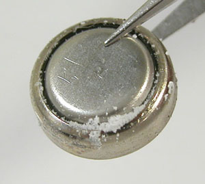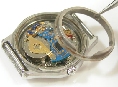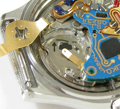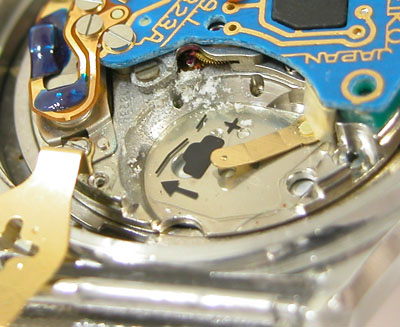 綺麗になったケースにムーブメントを戻して電池格納部をチェックしますが粉が・・・?