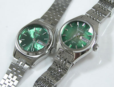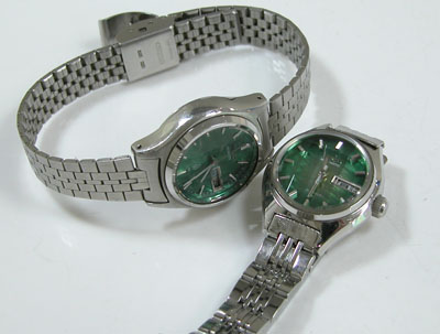 ソックリの腕時計ですが左はクォーツ。右は自動巻。クォーツから自動巻に変わっていった時代、デザインは大きく変わることは無かった時代ですね。